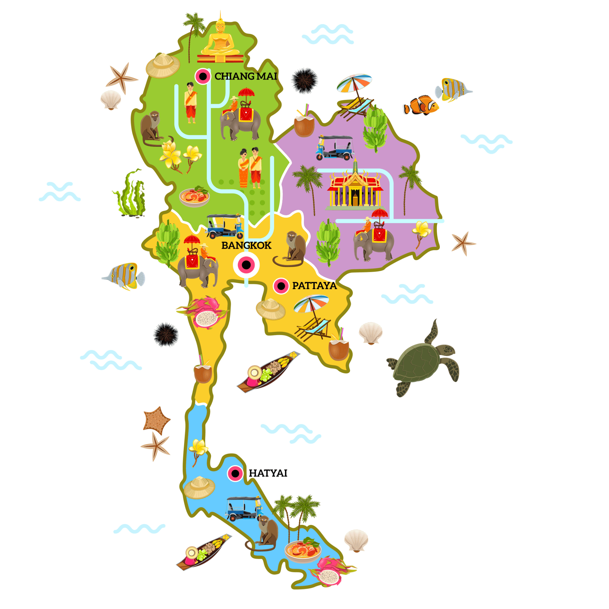 - Bangkok (4) → Chiang Mai (7) → Pai (3) → Islands (7)
